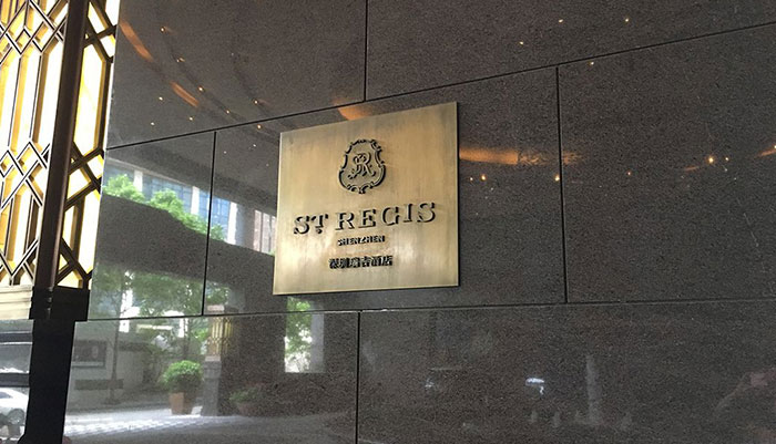 在標(biāo)識(shí)設(shè)計(jì)的時(shí)候,主要以青古銅結(jié)合裝修的色彩搭配。瑞吉酒店標(biāo)牌把瑞吉酒店展現(xiàn)的淋漓盡致。